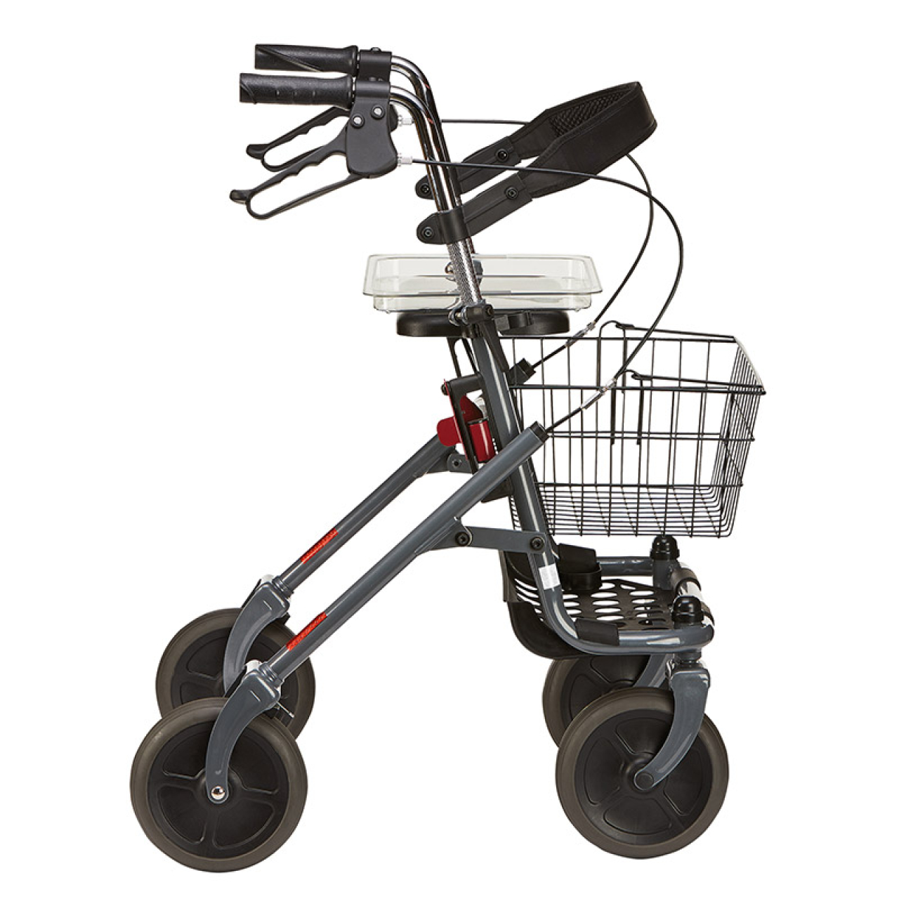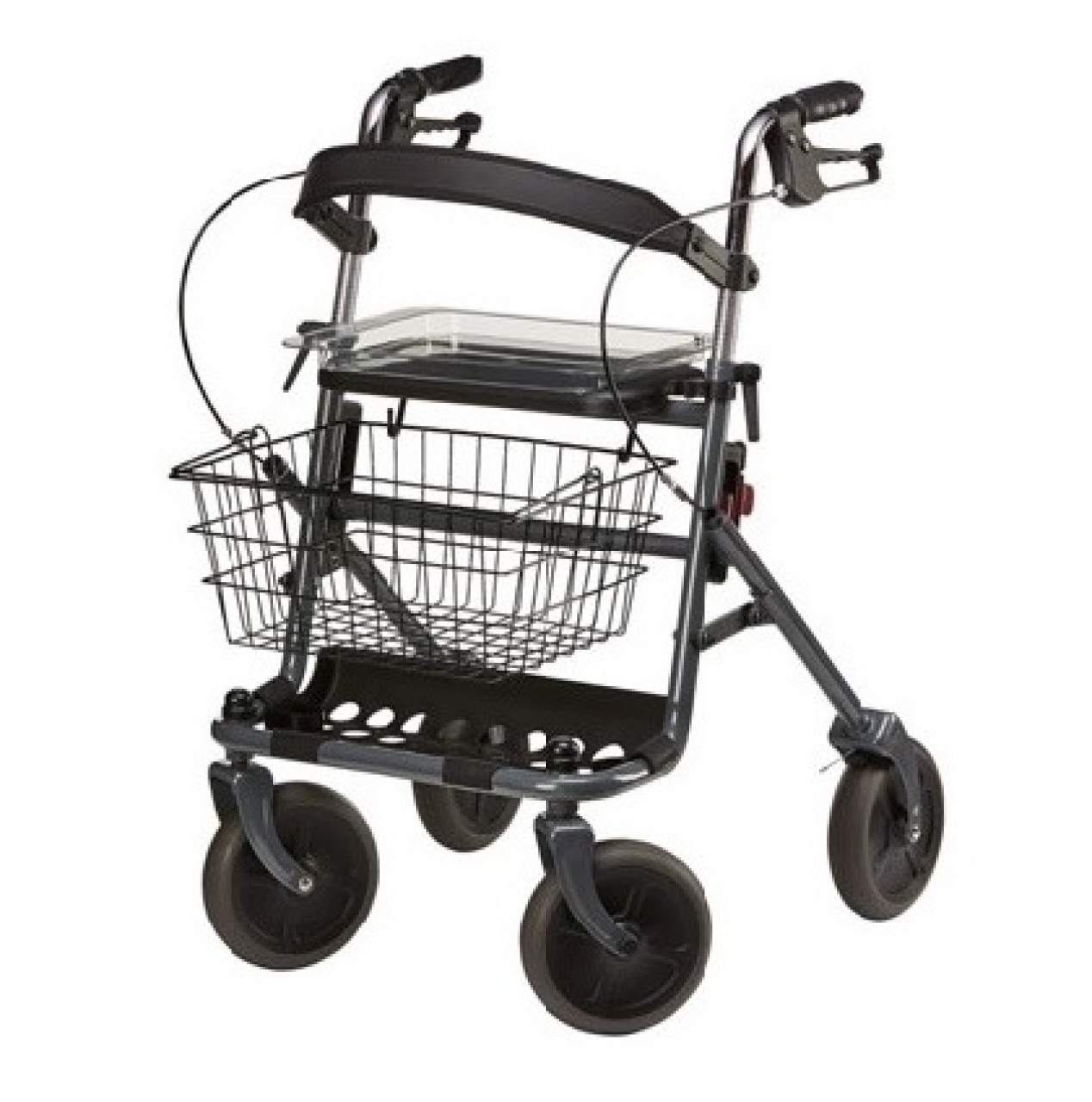 Tento rolátor (chodítko) je vybaven plynule výškově nastavitelnými rukojeťmi, což umožňuje snadné přizpůsobení dle výšky uživatele, tak aby bylo použití co nejvíce pohodlné a možné v pozici běžného držení těla. Dobré jízdní vlastnosti zajišťují černé PU pneumatiky, které jsou méně náchylné na znečištění, a integrované brzdy vybavené také funkcí parkovací aretace přidávají na bezpečnosti. Toto chodítko pro seniory se snadno skládá, což usnadňuje jeho skladování nebo přepravu a uskladnění. Někdy ho lidé nazývají také jako podpůrný vozík pro seniory. Je ideální nejen pro pohyb venku, ale také pro přepravu drobných předmětů v domácnosti.