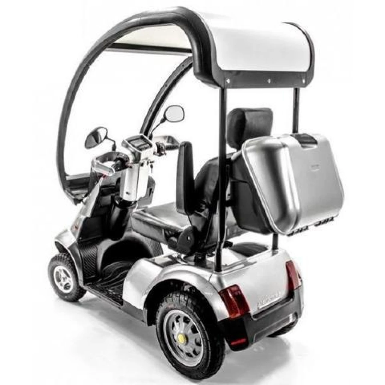 Luxusní elektrická čtyřkolka pro seniory Afikim S4 patří mezi velmi oblíbené elektro skútry. Nyní máme skladem omezené množství těchto skútrů vybavených střechou. Díky střeše je řidič chráněn před vlivy počasí a při jízdě si tak může užívat ještě většího komfortu, než nabízejí tyto vozíky v běžné výbavě. Společnost Afikim, která tento model vyrábí, patří mezi světově nejuznávanější společnosti ve svém oboru. Její elektrické invalidní skútry jsou kvalitní a pohodlné. Konkrétně tento model je držitelem ocenění za designe a řady mezinárodních certifikátů. Vysoký výkon a světlá výška dávají možnost jezdit i na projížďky do přírody. Tento kabinový skútr má dlouhý dojezd, nastavitelná řídítka, ortopedické sedadlo a mnoho další výbavy.