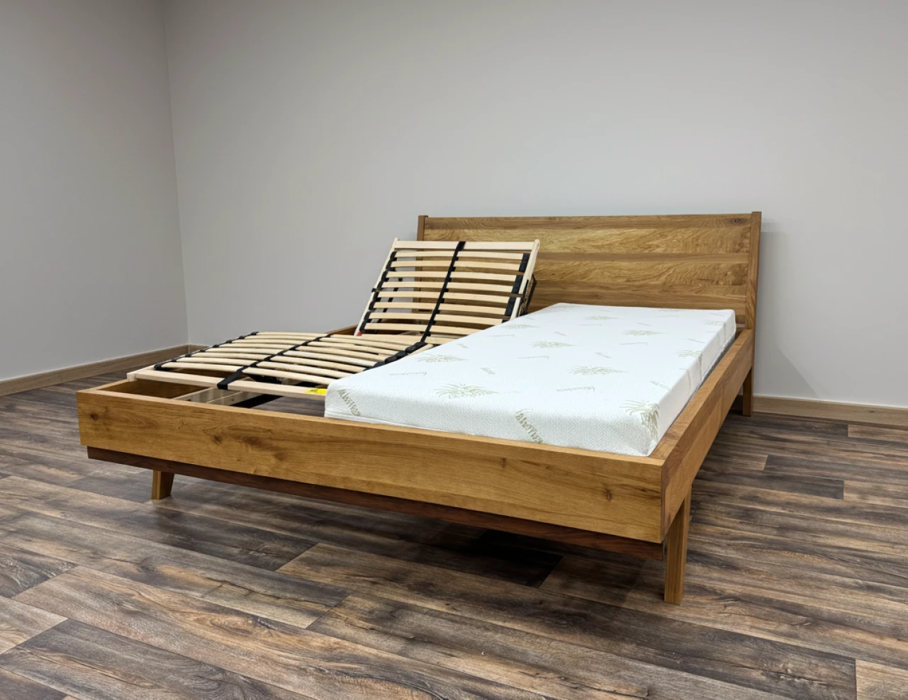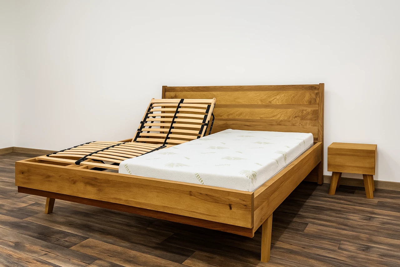 Manželská polohovací postel Rubín z masivního dubového dřeva představuje spojení moderní elegance, precizního zpracování a komfortního elektrického polohování. Svým subtilním designem a čistými liniemi působí lehce a luxusně, přesto si zachovává všechny výhody stabilní masivní konstrukce. Je ideální volbou pro zákazníky, kteří hledají designově výrazné dvoulůžko, jež nenápadně nabídne i zdravotní a komfortní benefity.