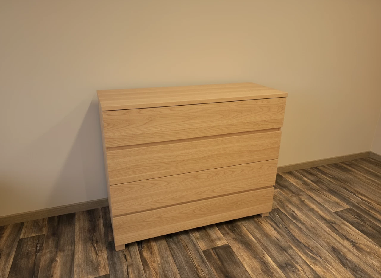 Komoda je vybavena čtyřmi prostornými zásuvkami s frézovanými úchyty, které podtrhují celkový vzhled nábytku a zajišťují pohodlné otevírání bez nutnosti použití kovových madel. Plnovýsuvy s tlumeným dovíráním zajišťují plynulý a tichý chod.